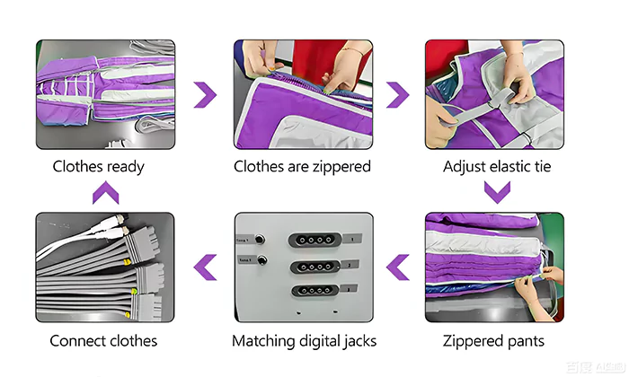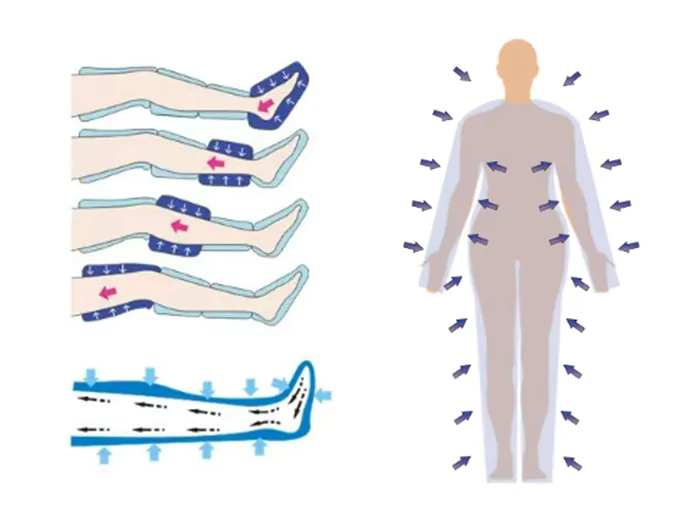 Pumping Action: The pressotherapy machine mimics a “pumping” effect, starting from the extremities (feet/hands) and moving toward the center of the body (heart).